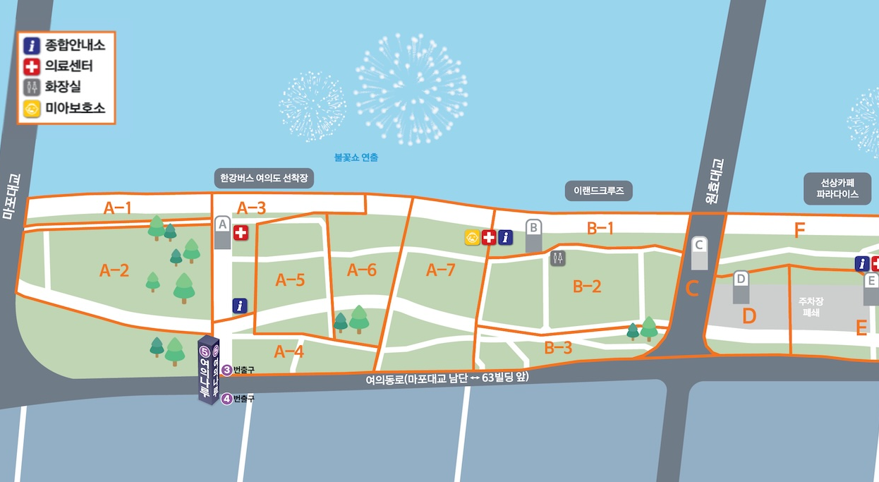 불꽃축제 현장에는 임시 화장실과 의료지원센터가 운영됩니다. ⛑️ 또한 여의도 주변에는 다양한 푸드트럭과 먹거리 부스가 마련되어 있어, 축제 분위기를 한껏 즐길 수 있습니다.